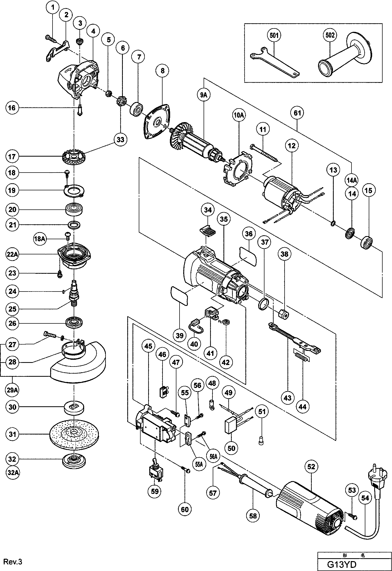 Hier finden Sie alle verfügbaren Teile und Zeichnungen der 'Hikoki G13YD'. Von hier aus können Sie alle gewünschten Teile direkt bestellen. Viele Teile müssen je nach Marke beim Hersteller bestellt werden, dies dauert ein bis vier Wochen. Alle Informationen, die wir haben, befinden sich auf unserer Website. Wir können Sie nicht beraten, was Sie benötigen. Dazu müssen Sie die Maschine zur Reparatur zurücksenden. Bitte beachten Sie bei der Bestellung Folgendes: