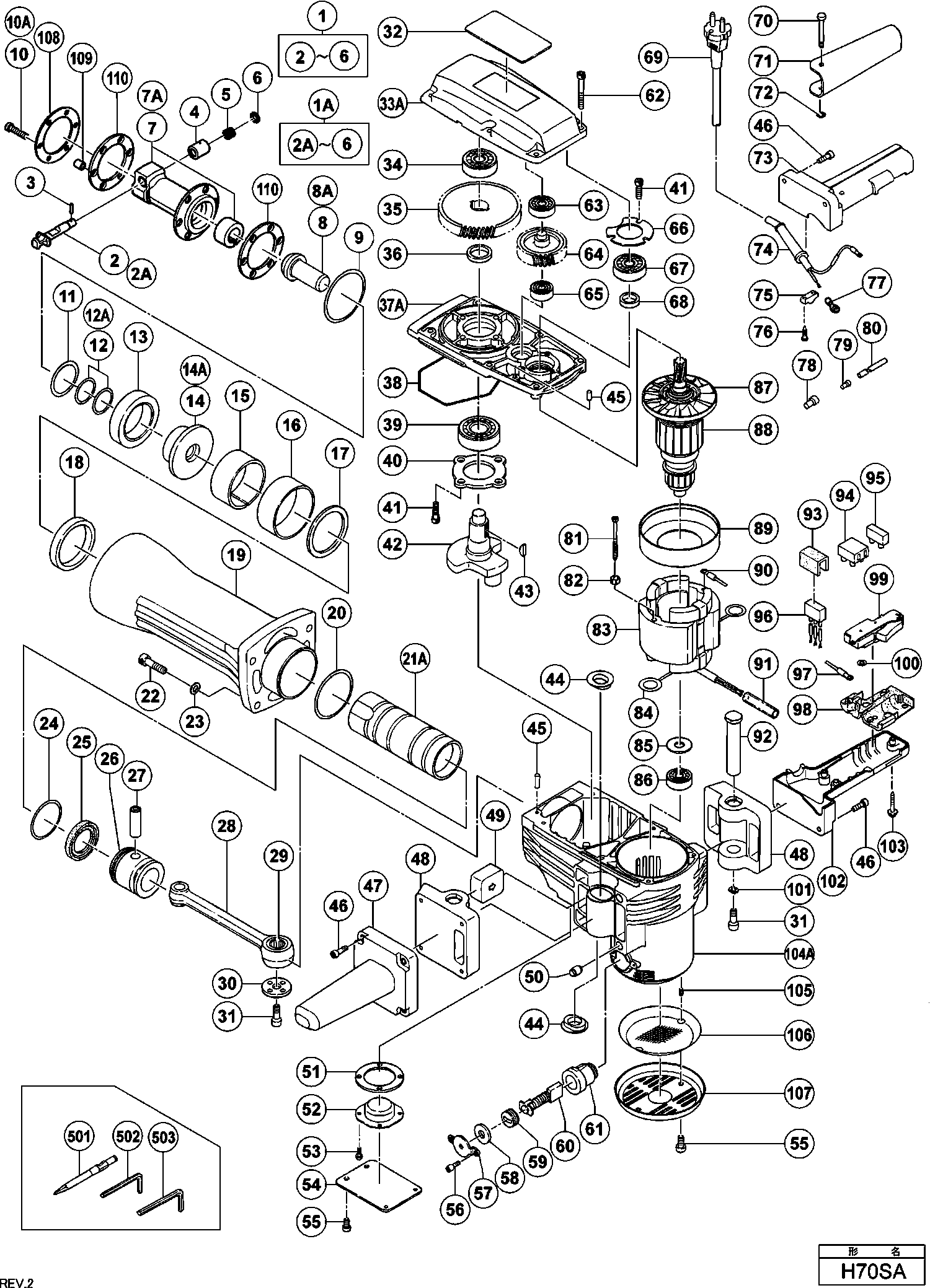 Hier finden Sie alle verfügbaren Teile und Zeichnungen der 'Hikoki H70SA'. Von hier aus können Sie alle gewünschten Teile direkt bestellen. Viele Teile müssen je nach Marke beim Hersteller bestellt werden, dies dauert ein bis vier Wochen. Alle Informationen, die wir haben, befinden sich auf unserer Website. Wir können Sie nicht beraten, was Sie benötigen. Dazu müssen Sie die Maschine zur Reparatur zurücksenden. Bitte beachten Sie bei der Bestellung Folgendes: