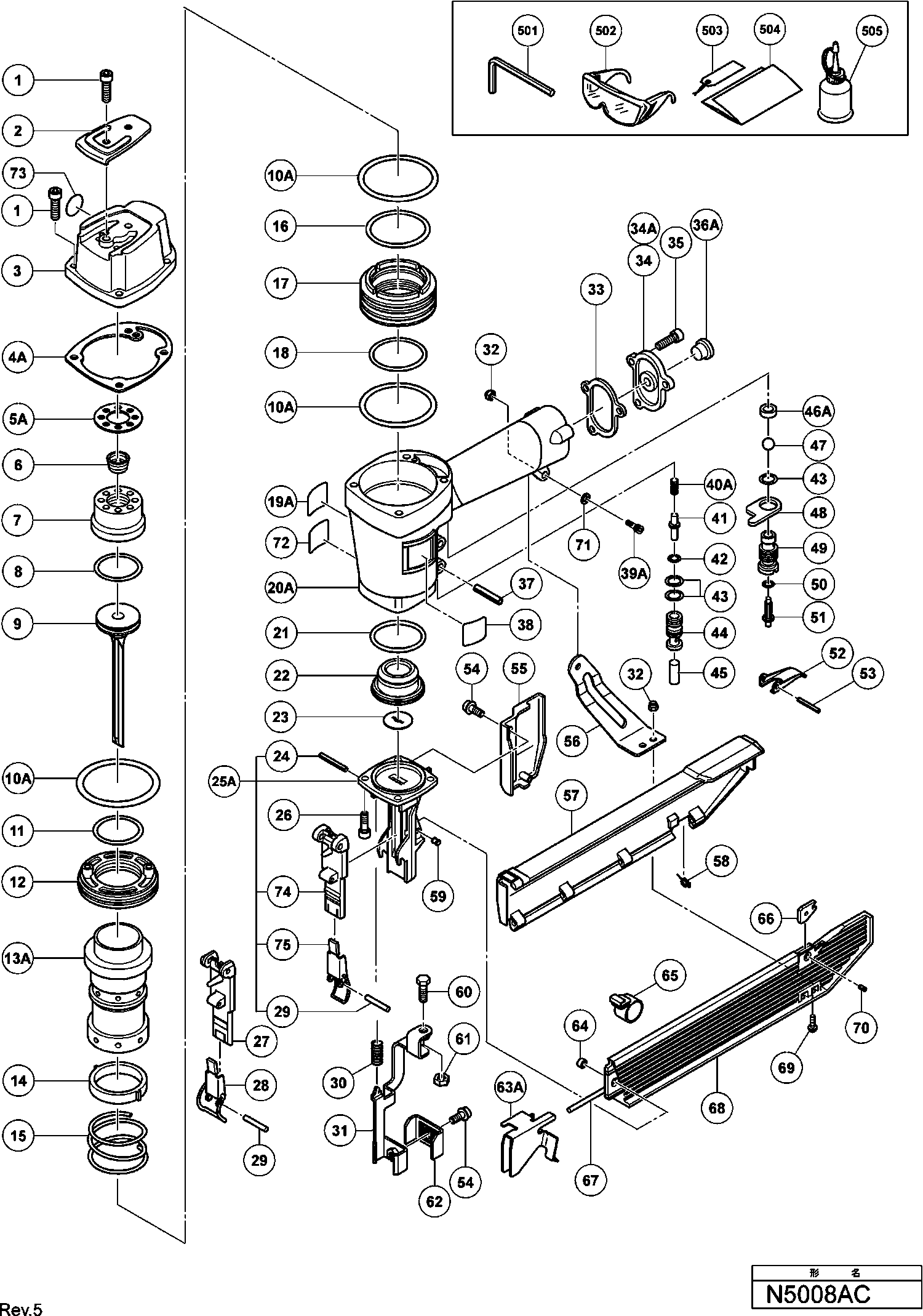 Hier finden Sie alle verfügbaren Teile und Zeichnungen der 'Hikoki N5008AC'. Von hier aus können Sie alle gewünschten Teile direkt bestellen. Viele Teile müssen je nach Marke beim Hersteller bestellt werden, dies dauert ein bis vier Wochen. Alle Informationen, die wir haben, befinden sich auf unserer Website. Wir können Sie nicht beraten, was Sie benötigen. Dazu müssen Sie die Maschine zur Reparatur zurücksenden. Bitte beachten Sie bei der Bestellung Folgendes:
