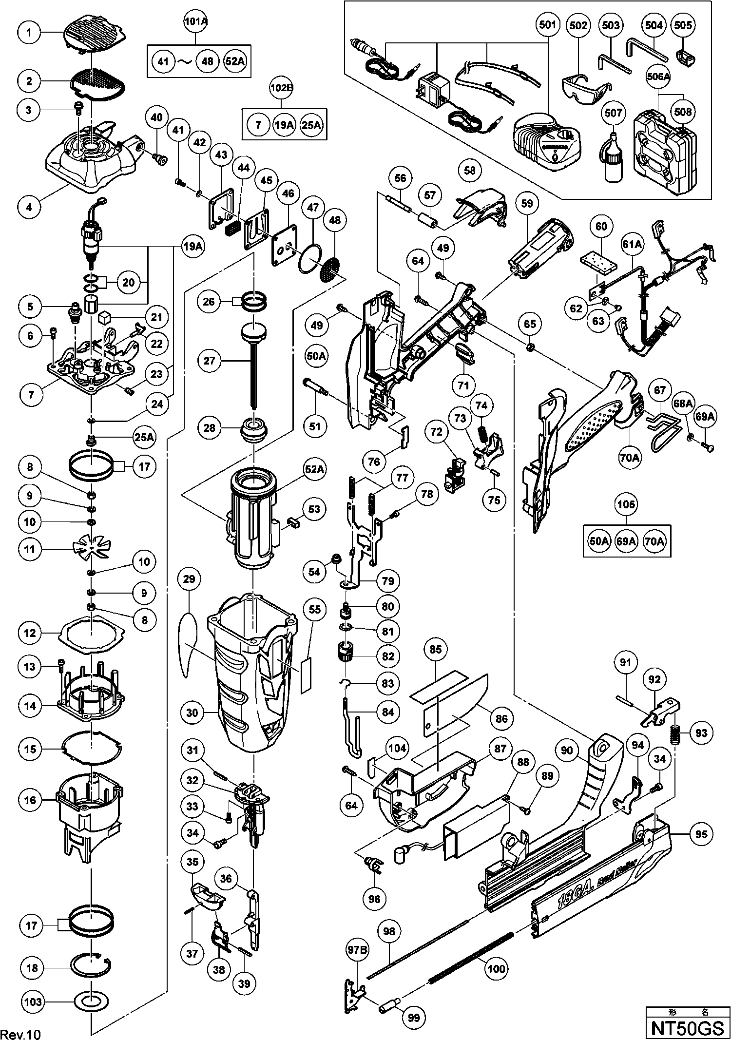 Hier finden Sie alle verfügbaren Teile und Zeichnungen der 'Hikoki NT50GS'. Von hier aus können Sie alle gewünschten Teile direkt bestellen. Viele Teile müssen je nach Marke beim Hersteller bestellt werden, dies dauert ein bis vier Wochen. Alle Informationen, die wir haben, befinden sich auf unserer Website. Wir können Sie nicht beraten, was Sie benötigen. Dazu müssen Sie die Maschine zur Reparatur zurücksenden. Bitte beachten Sie bei der Bestellung Folgendes: