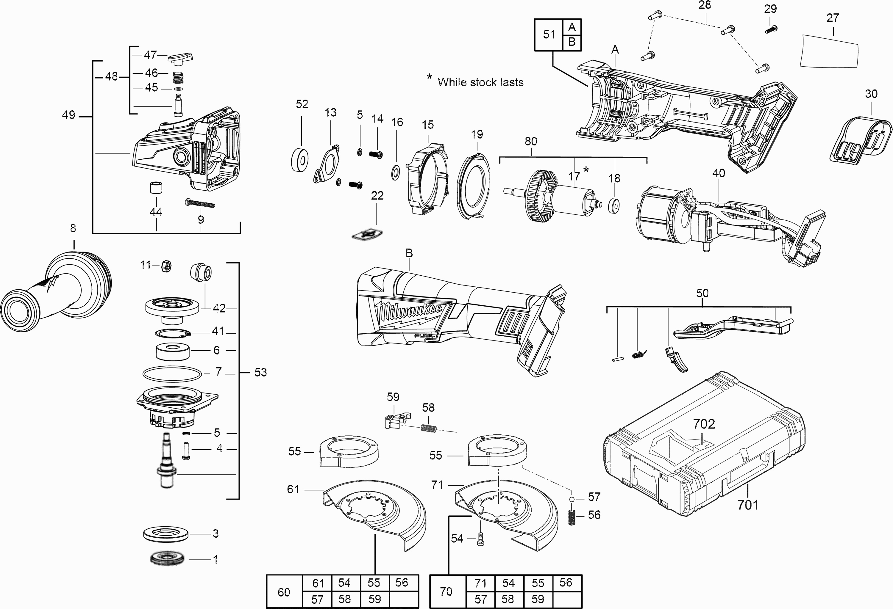 Hier finden Sie alle verfügbaren Teile und Zeichnungen der 'Milwaukee 4000458524 ( M18CAG125XPDB-0 )'. Von hier aus können Sie alle gewünschten Teile direkt bestellen. Viele Teile müssen je nach Marke beim Hersteller bestellt werden, dies dauert ein bis vier Wochen. Alle Informationen, die wir haben, befinden sich auf unserer Website. Wir können Sie nicht beraten, was Sie benötigen. Dazu müssen Sie die Maschine zur Reparatur zurücksenden. Bitte beachten Sie bei der Bestellung Folgendes: